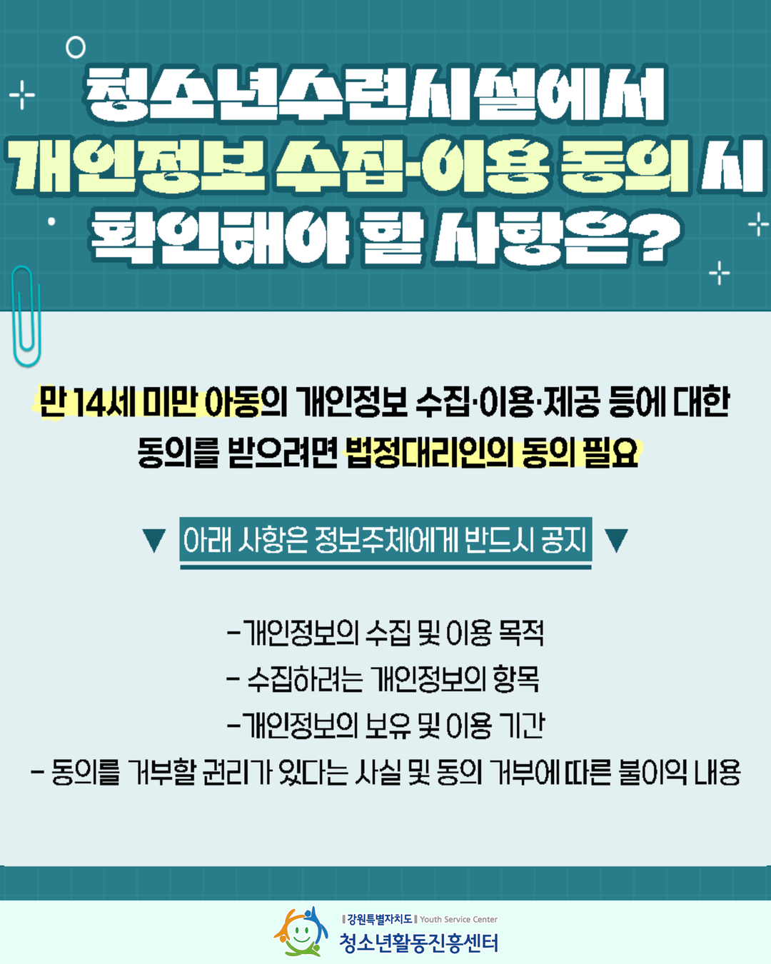 - 수집·이용 목적, 항목, 기간, 거부권 보장 반드시 안내