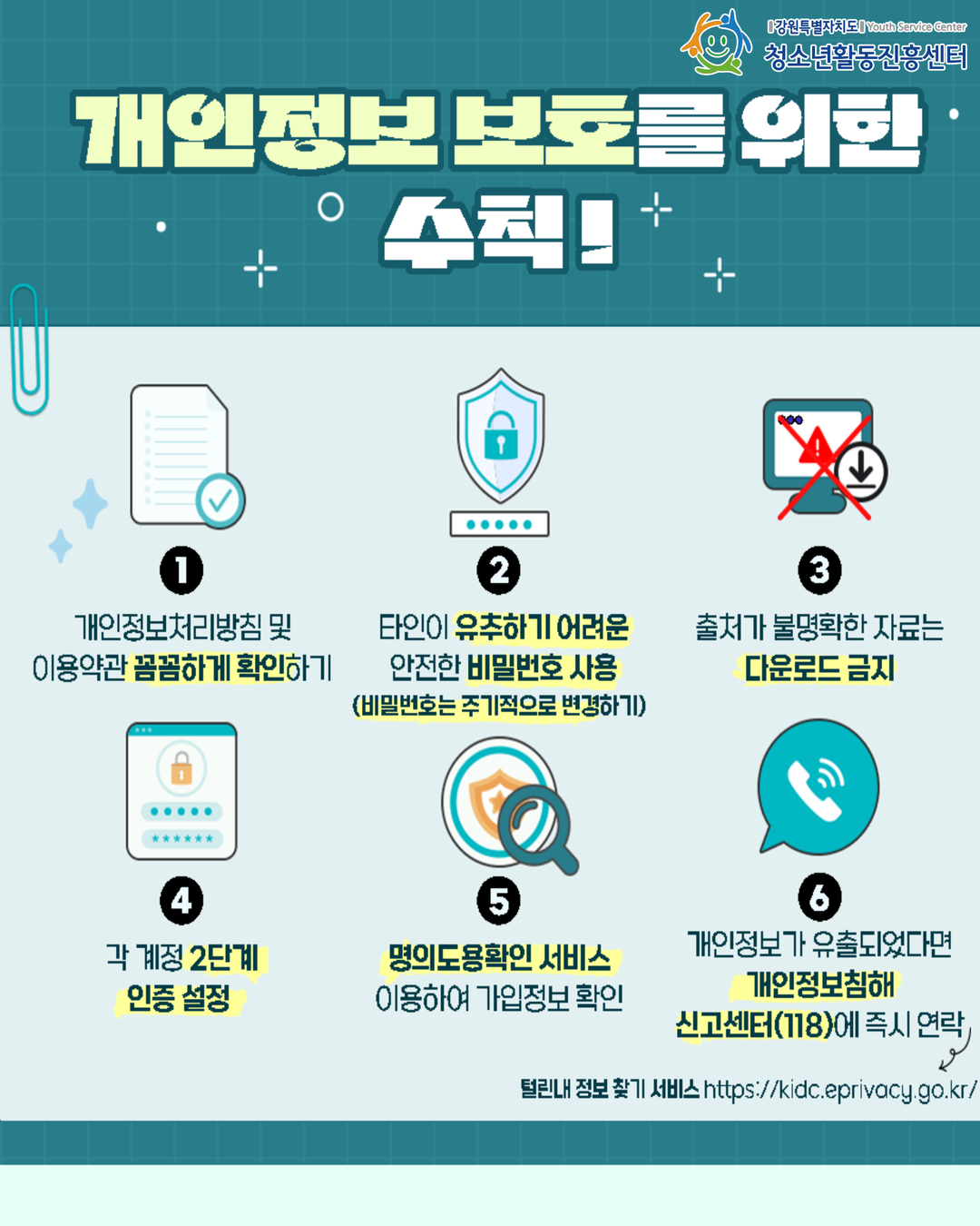 | 제목 | [안전해주세요] 🔒 개인정보 보호는 선택이 아닌 필수! - 온라인 시대, 개인정보는 스스로 지켜야 해요 | ||||