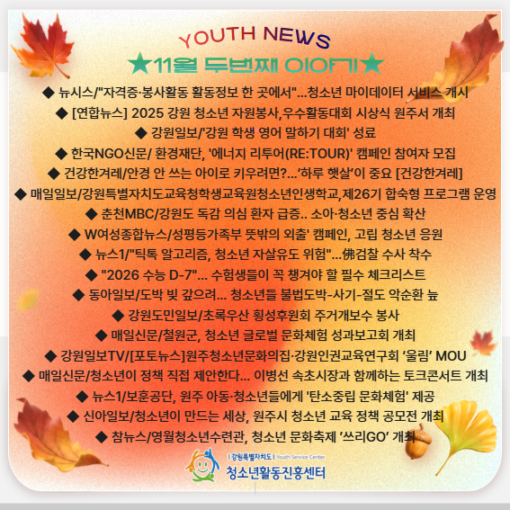 | 제목 | ★11월 두 번째 Youth News★ | ||||