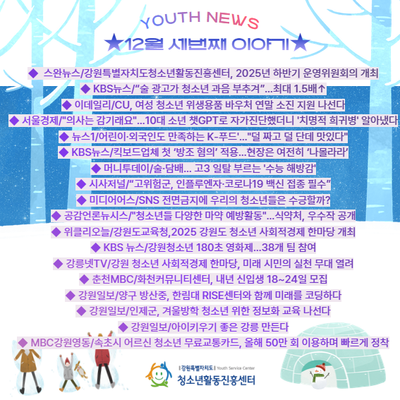 | 제목 | ★12월 세 번째 Youth News★ | ||||