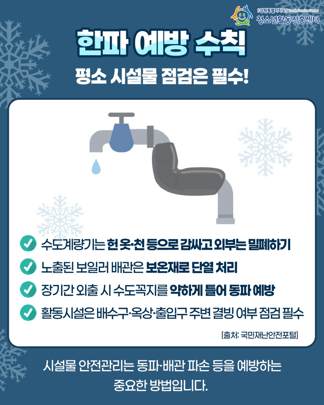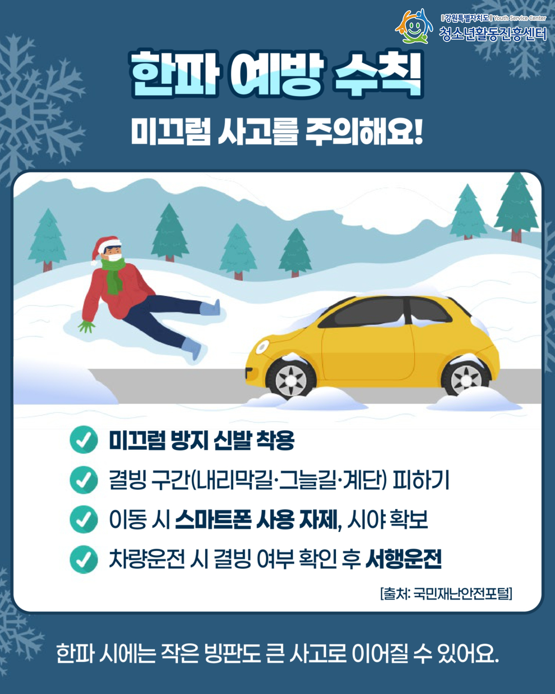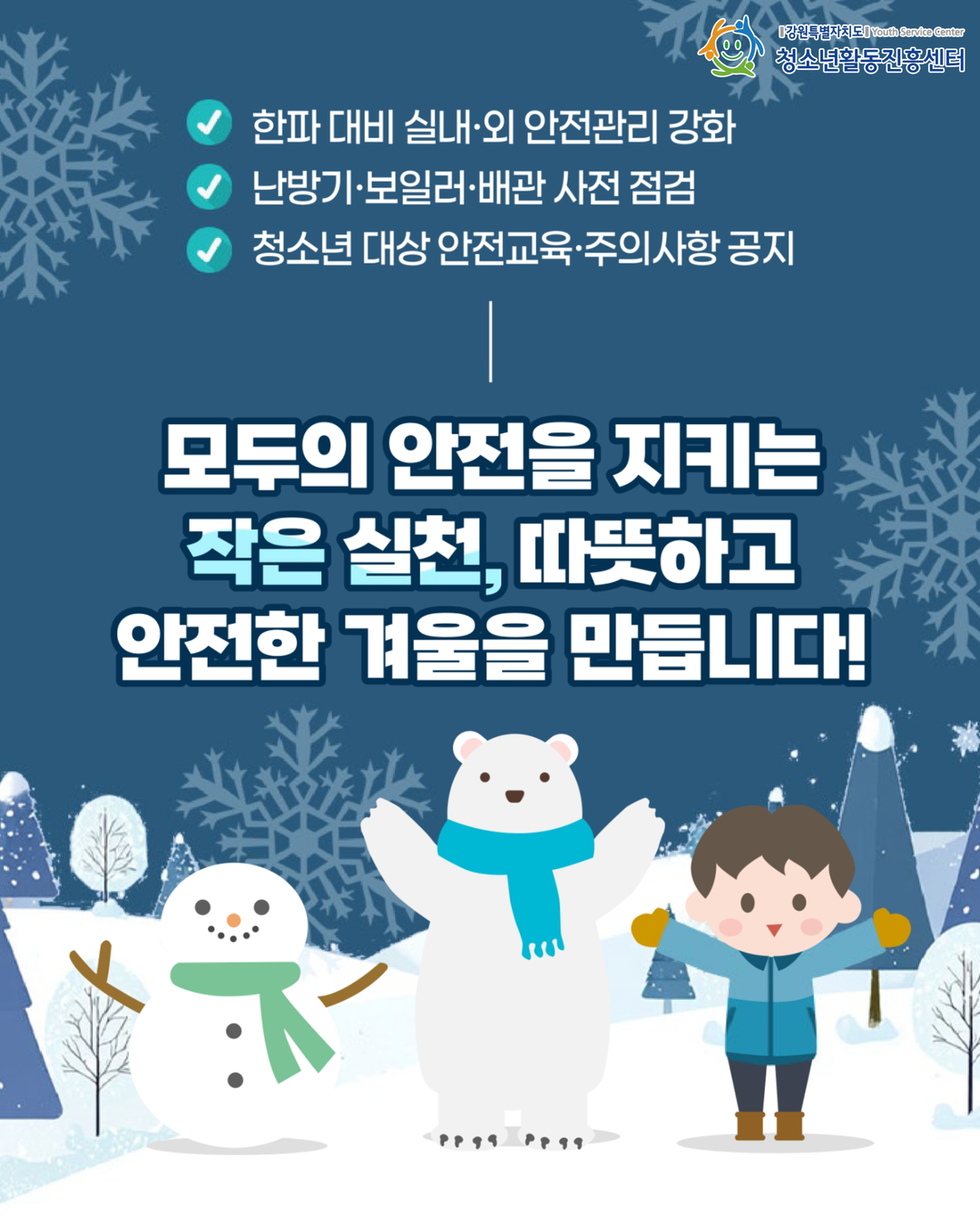 | 제목 | [안전해주세요] ❄️ 청소년활동 안전을 위한 한파 예방 실천 가이드 | ||||