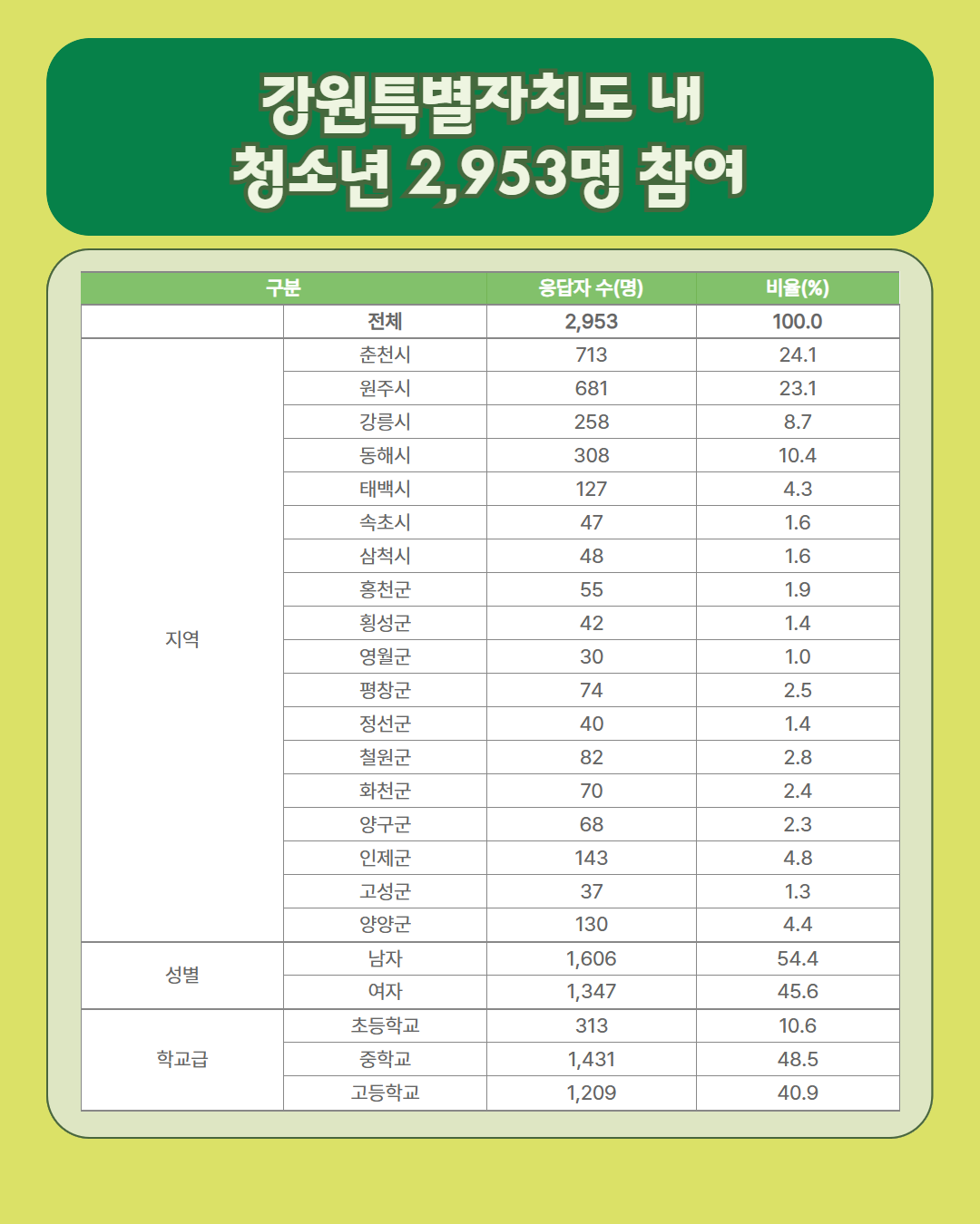 ✔ 조사대상: 강원특별자치도 18개 시·군 중·고등학생 2,953명