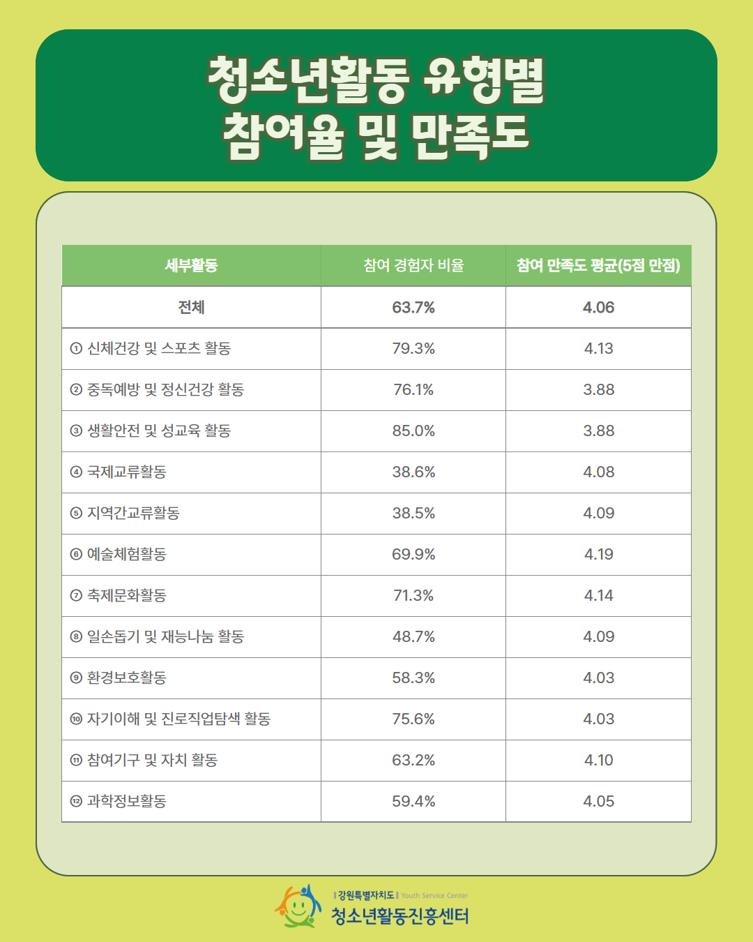 | 제목 | 2025년 강원특별자치도 청소년활동 실태 및 요구조사 - ① 청소년활동 유형별 참여율 및 만족도 | ||||