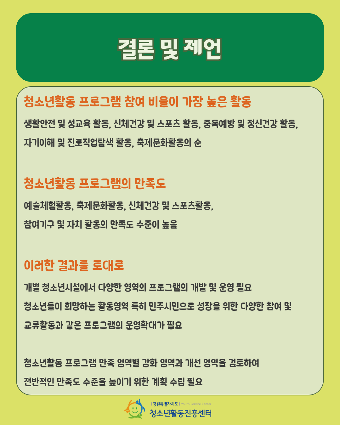 2025년 강원특별자치도 청소년활동 실태 및 요구조사 본보고서와 요약본을 참고해주시기 바랍니다.