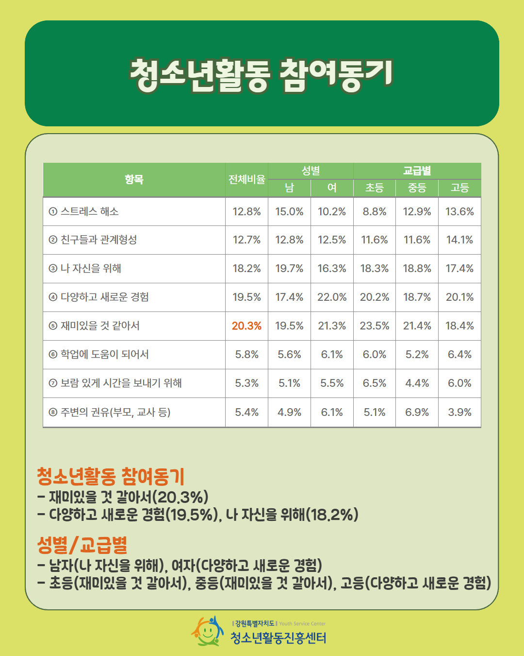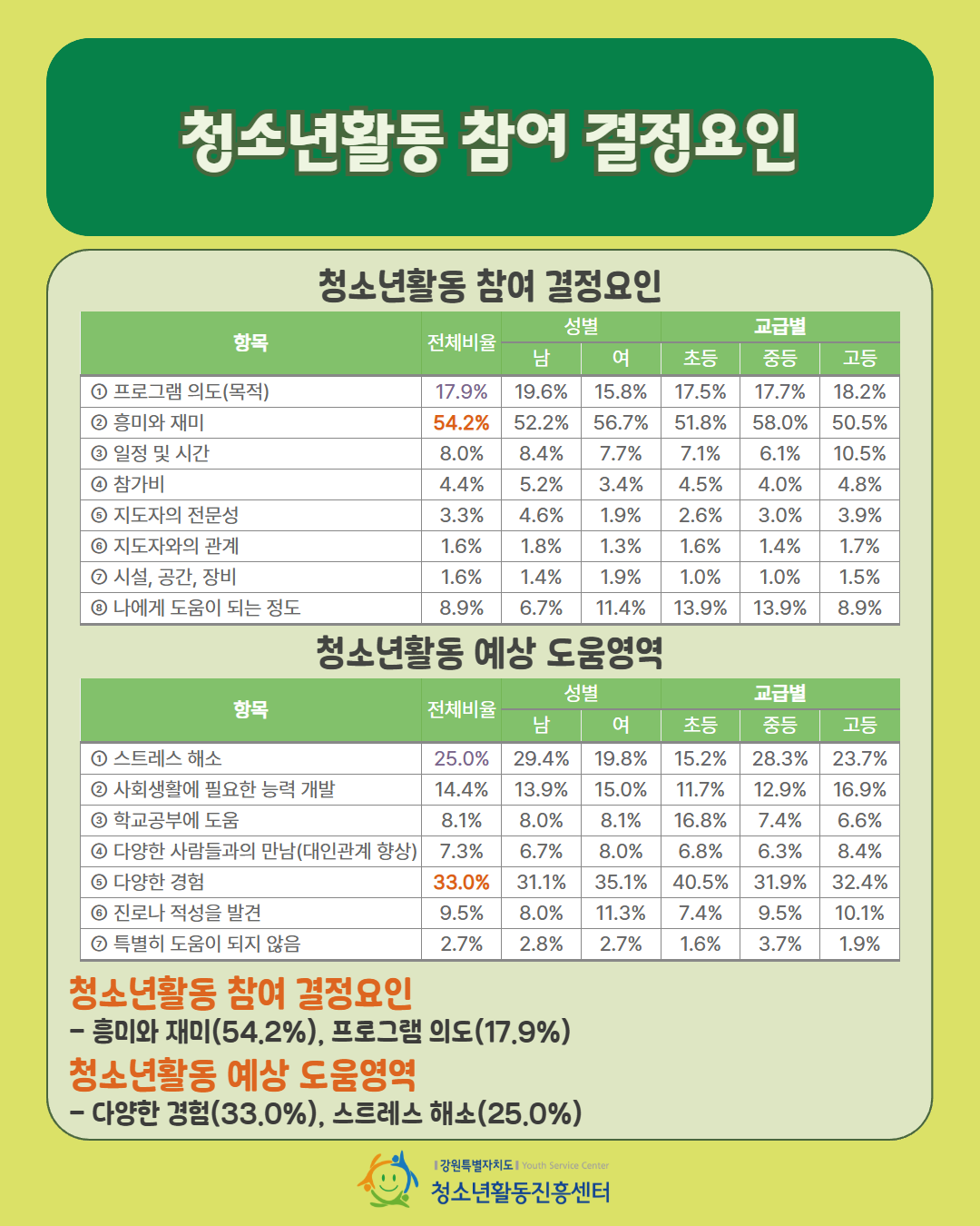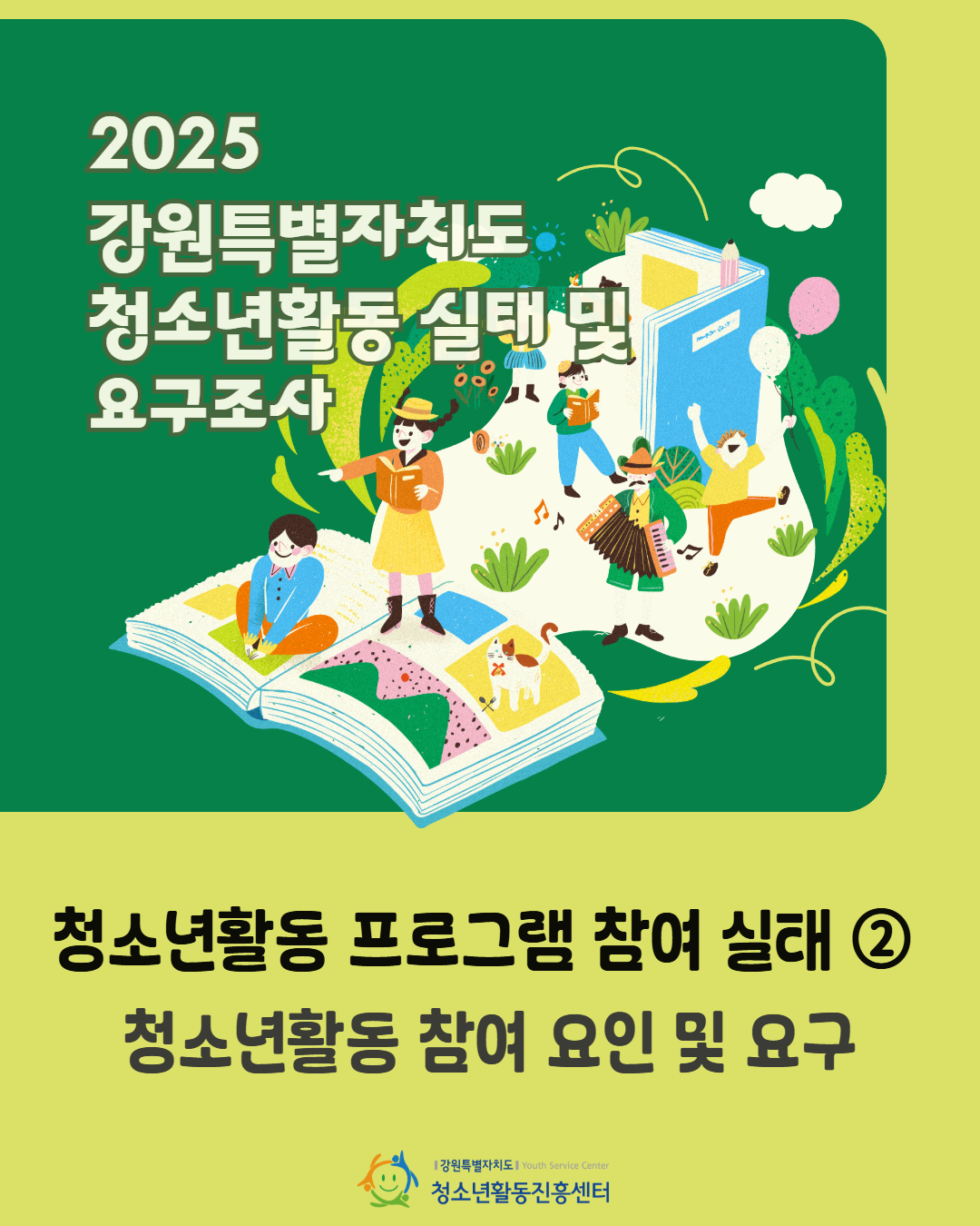 '2025년 강원특별자치도 청소년활동 실태 및 요구조사 - 청소년활동 참여 요인 및 요구'편 입니다.