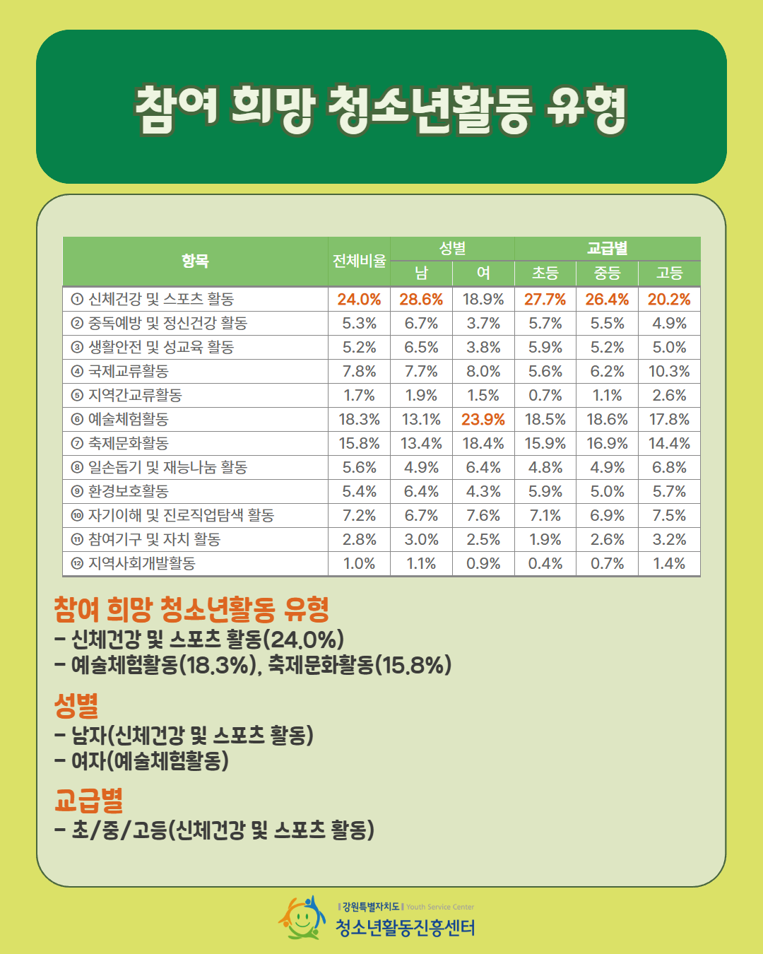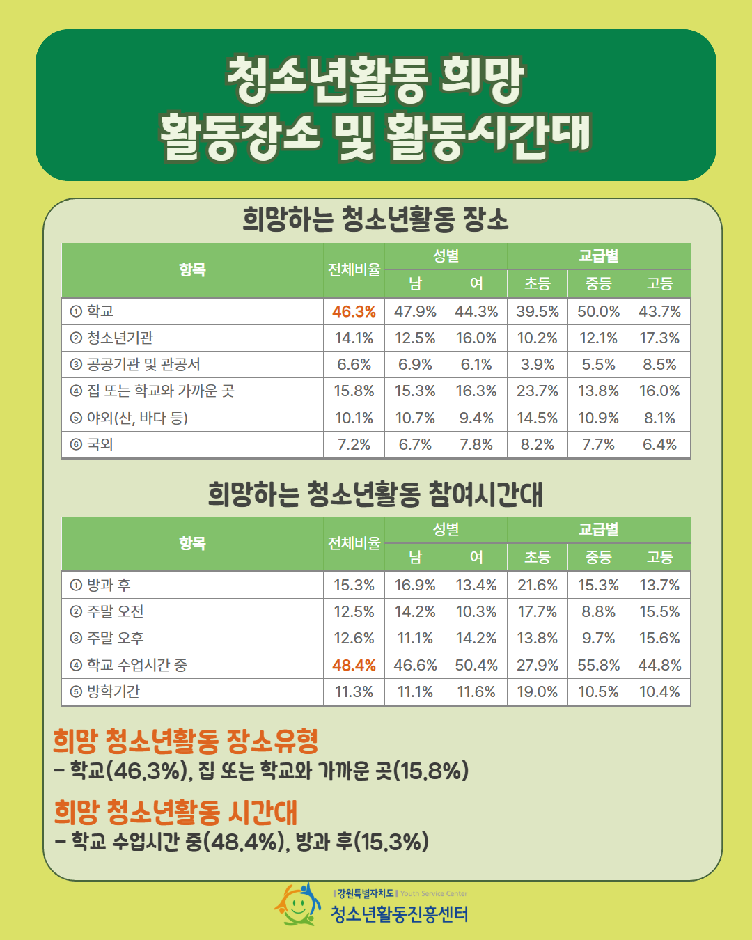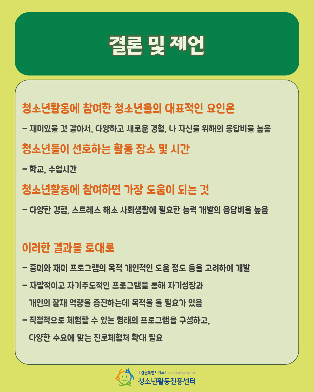 2025년 강원특별자치도 청소년활동 실태 및 요구조사 본보고서와 요약본을 참고해주시기 바랍니다.