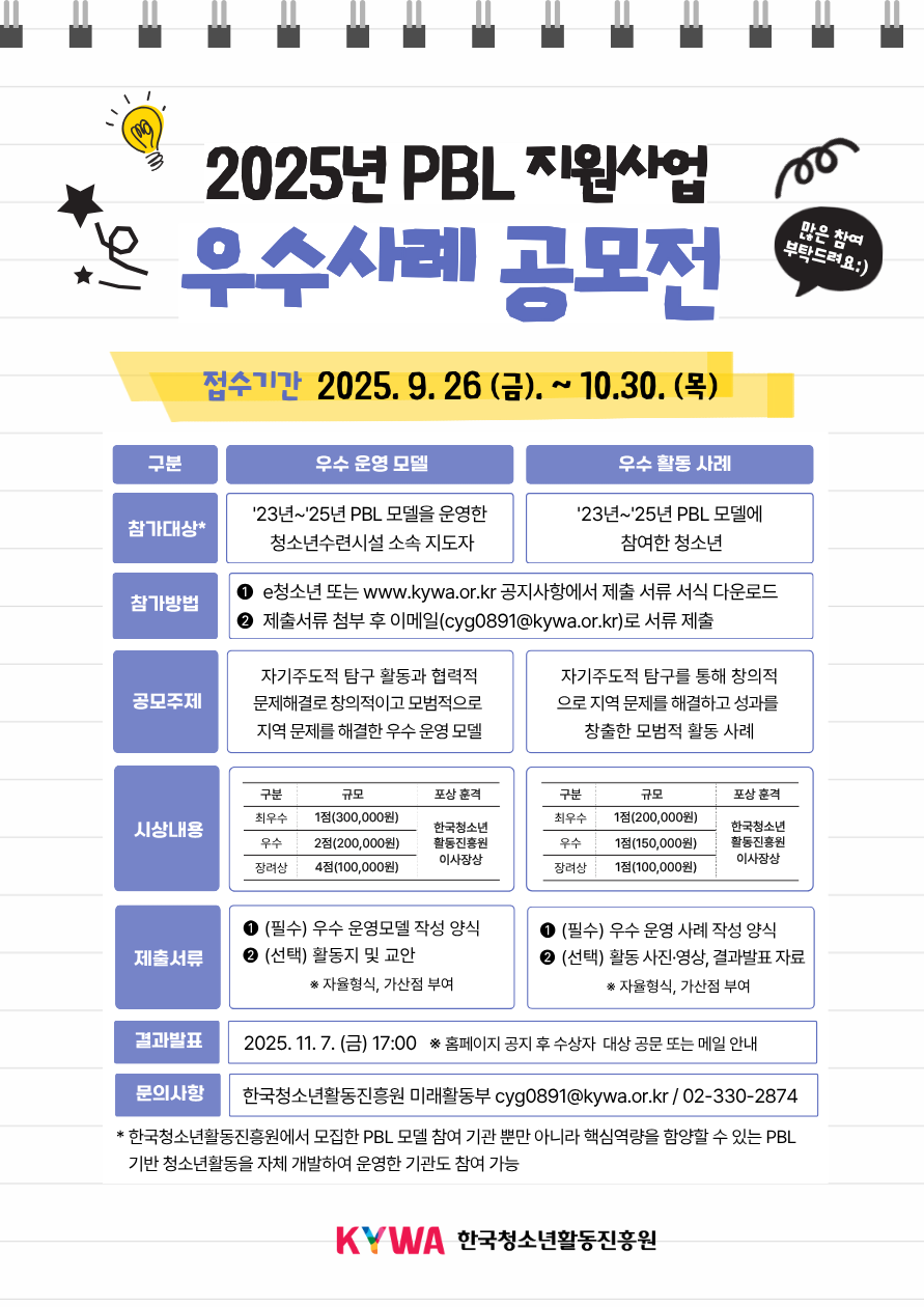 한국청소년활동진흥원(KYWA)은 우수한 청소년활동 핵심역량 기반 PBL 모델 발굴·보급하여 청소년활동 활성화를 도모하고자「핵심역량 기반 PBL 지원사업 우수 사례 공모전」사업을 다음과 같이 개최하오니 많은 관심과 참여 바랍니다.