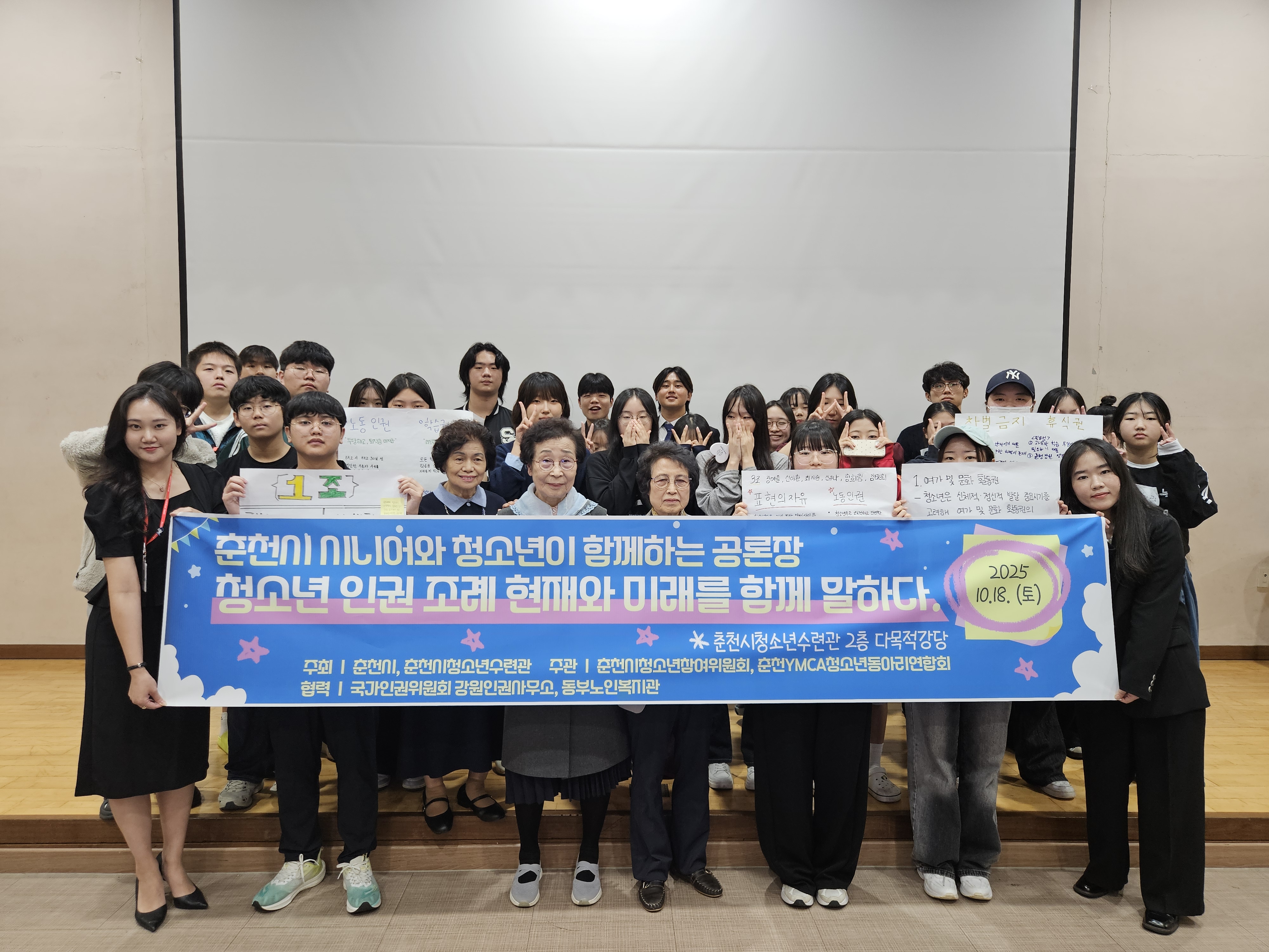 춘천시청소년수련관(관장 이영원)은 10월 18일(토) 춘천시청소년수련관에서 춘천시청소년참여위원회 위원 및 춘천YMCA청소년동아리연합회, 지역 청소년, 국가인권위원회 강원인권사무소, 동부노인복지관 시니어, 관계자 등 40여명이 참석한 가운데 2025년 춘천시 시니어와 청소년이 함께하는 공론장 ‘청소년 인권 조례 현재와 미래를 함께 말하다.’를 개최하였다.