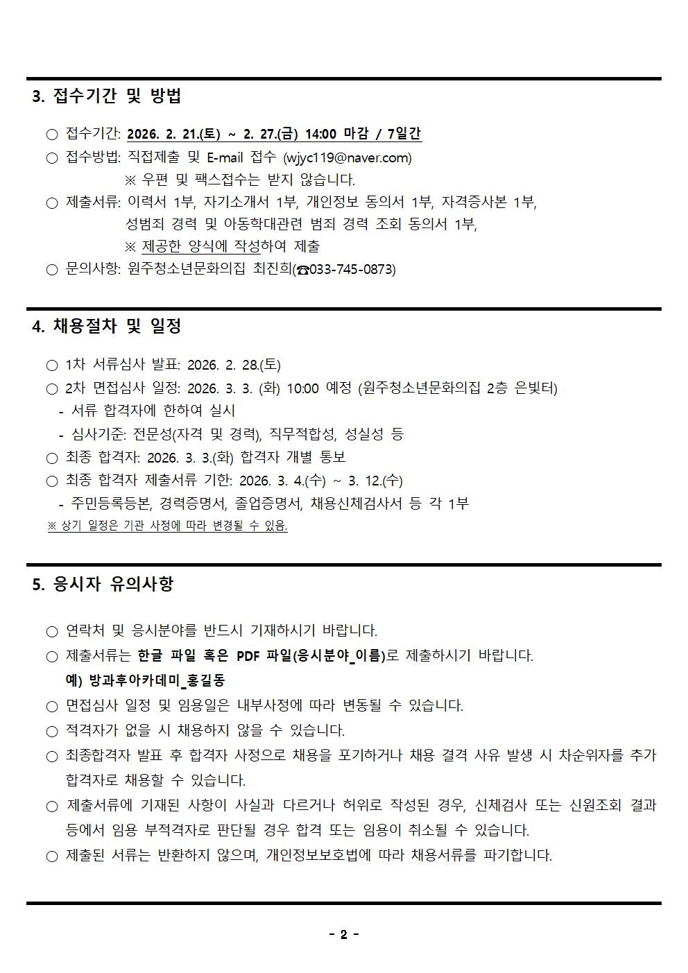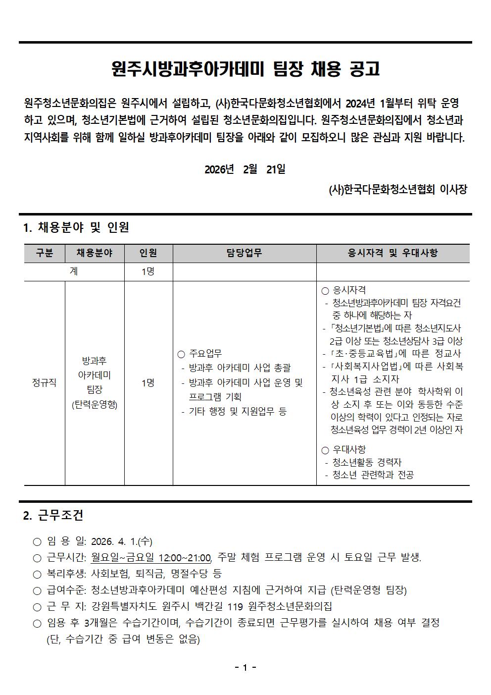 [채용공고] 원주청소년문화의집 원주시방과후아카데미 팀장 채용