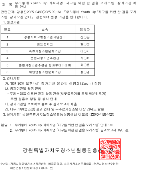우리동네 Youth Up 기획사업 지구를 위한 한 걸음 포레스텝 참가기관 확정 안내