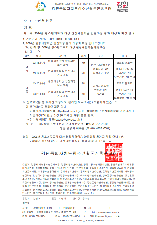 2026년 청소년지도자 대상 현장체험학습 안전과정 참가 대상자 확정 안내