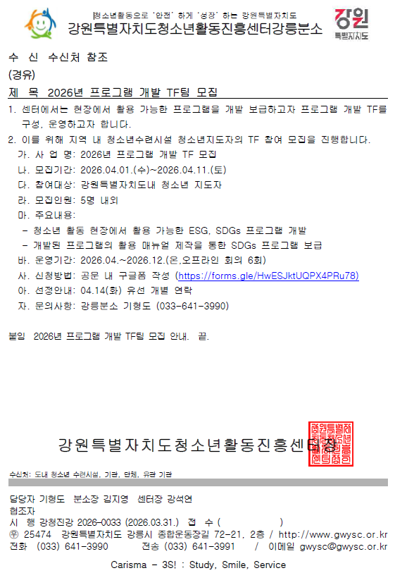 [강릉분소] 2026년 프로그램 개발 TF 모집