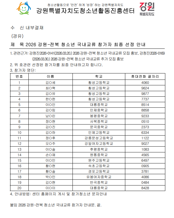 2026 강원 전북 청소년 국내교류 참가자 최종 선정 안내드립니다.