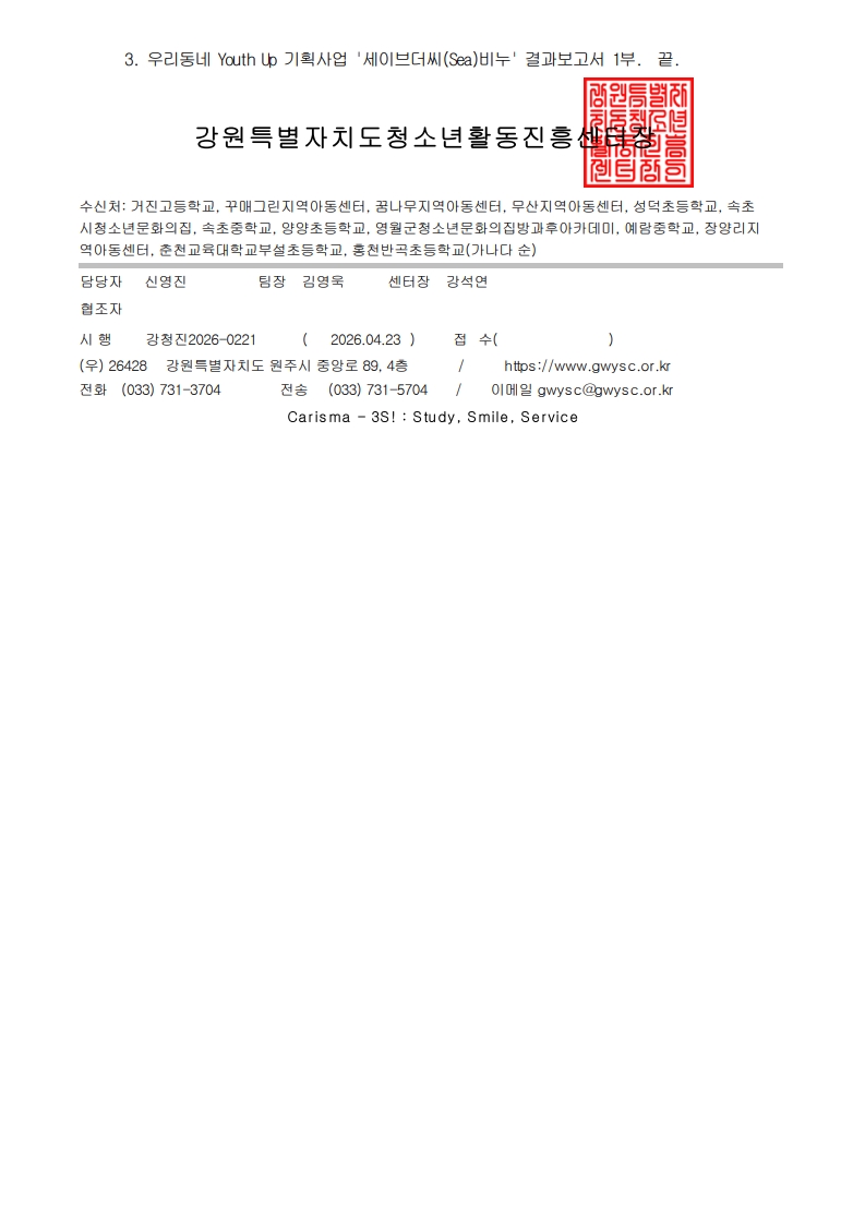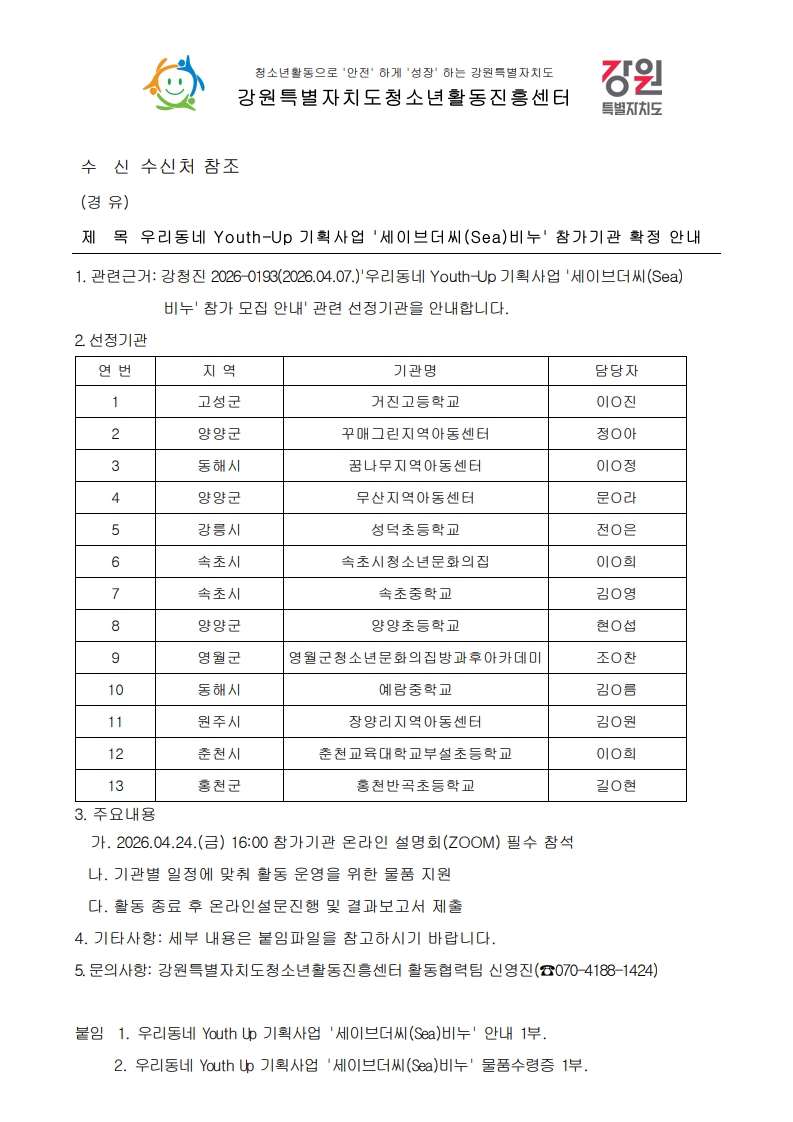 | 제목 | 2026 우리동네 Youth-Up 기획사업 '세이브더씨(Sea)비누' 참가기관 확정 안내 | ||||