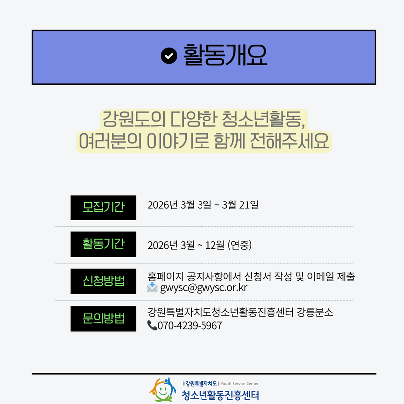 2026년에도 강원특별자치도에서 일어나는 다양한 청소년활동소식을 기다립니다 :)